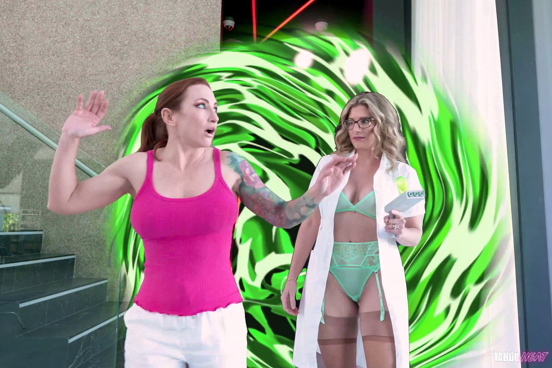 A portal opens up and Cory Chase and her step niece, Summer (Sophia Locke) walk through it. Cory sits down with her Summer and her alternate-universe-step-brother Luke Longy on the couch, so she can have a chat with them. Cory tells Summer and Luke that in this universe, she's going to need them to get along and to touch each other! 'Now touch your step-sister!' Cory tells Luke. Luke is hesitant at first, but he slowly touches her leg at first. Now that they're getting more comfortable, Cory asks Luke to reach out and touch Summer's big tits. Luke's cock starts to get hard, and Cory advises Summer to give a handjob or a blowjob! Summer lifts her hot pink tank top up over her head, and she exposes her big tits to both Luke and her step-aunt. Summer wants to touch Luke's cock next, and that's exactly what she does. Summer decides to be a good step-sister so she slowly starts to jerk Luke's cock with her hand. Their step-aunt, Cory, gets behind Summer and she starts to play with her step-niece's tits while Summer is still jerking off Luke's cock. Summer finally wraps her lips around Luke's cock and she motions her head up and down as she gives him a blowjob.